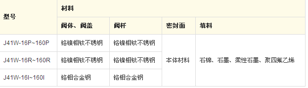J41W型PN16~PN160不銹鋼截止閥:手動(dòng)、法蘭連接、直通式、閥座密封面材料為 0Cr18Ni9 系不銹鋼(J41W-16P~160P)、0Cr17Ni12Mo2 系不銹鋼(J41W-16R~160R)、1Cr5Mo 鉻鉬鋼(J41W-16I~160I),公稱(chēng)壓力 PN16~PN160,閥體材料為 0Cr18Ni9 系不銹鋼(J41W-16P~160P)、0Cr17Ni12Mo2 系不銹鋼(J41W-16R~160R)、1Cr5Mo 鉻鉬鋼(J41W-16I~160I)的截止閥。